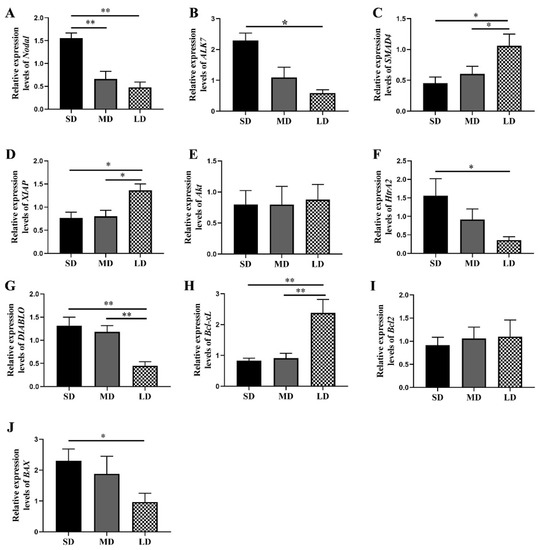 Key gene expression levels in the Nodal/ALK7 signaling pathway in the ovaries of Phodopus sungorus under three photoperiod conditions. (A) Nodal, (B) ALK7, (C) SMAD4, (D) XIAP, (E) Akt, (F) HtrA2, (G) DIABLO, (H) Bcl-xL, (I) Bcl2, and (J) BAX. Values are means ± SEM. n = 6. SD, short daylight; MD, moderate daylight; LD, long daylight. * p < 0.05, ** p < 0.01.
