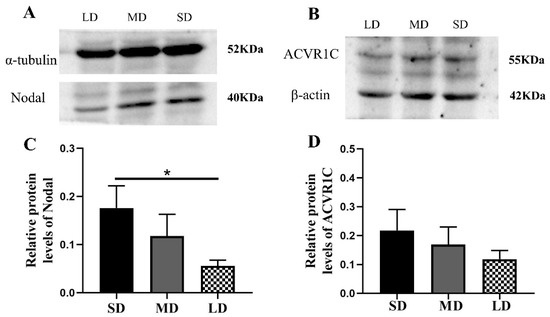 Levels of the Nodal and ACVR1C protein expression in the ovaries of Phodopus sungorus under three photoperiod conditions. (A,B) Representative immunoblots of the key Nodal and ACVR1C proteins and internal reference proteins (α-tubulin and β-actin) in three different photoperiod groups. (C,D) Relative protein expression of Nodal and ACVR1C. Values are means ± SEM. n = 8. SD, short daylight; MD, moderate daylight; LD, long daylight. * p < 0.05.