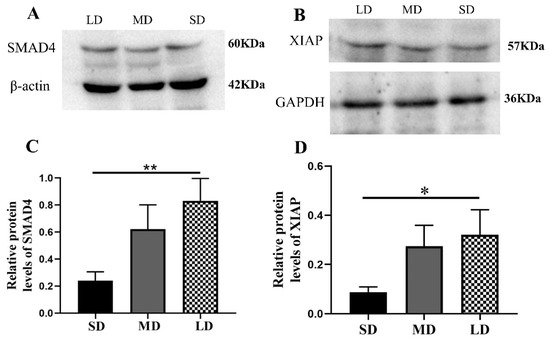 Compared with the MD and LD groups, the Nodal expression was higher in the SD group (p < 0.01), whereas the ALK7 expression was significantly higher in the SD group, compared with the LD group (p < 0.05; Figure 6A,B). Furthermore, compared with the MD and SD groups, the levels of the SMAD4 and XIAP expressions were markedly increased in the LD group (p < 0.05; Figure 6C,D).