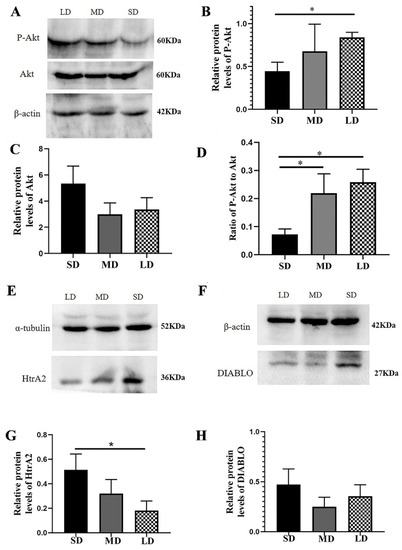 Our findings further suggested that the Akt expression followed the order LD > MD > SD (p > 0.05; Figure 6E). In addition, compared with the LD group, the HtrA2 expression was markedly increased in the SD group (p < 0.05), while the DIABLO expression was significantly decreased in the LD group, compared with the other two groups (p < 0.01; Figure 6F,G).
