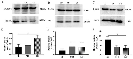 The results further showed that the Bcl-xL protein expression was significantly different between the SD and LD groups (p < 0.05; Figure 10A,D). The Bcl2 expression was also lower in the SD group, but not significantly different in the other groups (p > 0.05; Figure 10B,E). The BAX protein expression was notably increased in the SD group, compared with that in the LD group (p < 0.05; Figure 10C,F).