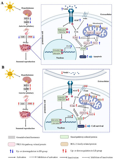 Molecular mechanism diagram of the photoperiod regulating the seasonal reproduction in female Phodopus sungorus. (A) Regulation mechanism of FSH-Nodal/ALK7 signal pathway under short daylight condition. (B) Regulation mechanism of FSH-Nodal/ALK7 signal pathway under long daylight condition. IGF-1: insulin growth factor 1; GnRH: gonadotropin-releasing hormone; FSH: follicle-stimulating hormone; LH: luteinizing hormone; ALK7: activin receptor-like kinase 7; BAX: bcl-2-associated X protein; Bcl-2: B-cell lymphoma-2; P-Akt: phosphate-Akt; HtrA2: High temperature requirement protein a2.