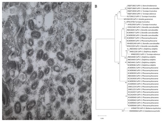 (A) Poxvirus particles in skin lesions of Burmeister’s porpoise (Phocoena spinipinnis) MFB-499 from central Peru (15,000 x magnification); (B) Phylogenetic tree among DNA polymerase nucleotide sequences of cetacean poxviruses available in GenBank “ adapted with permission from [10]. 2022, L. Luciani”.