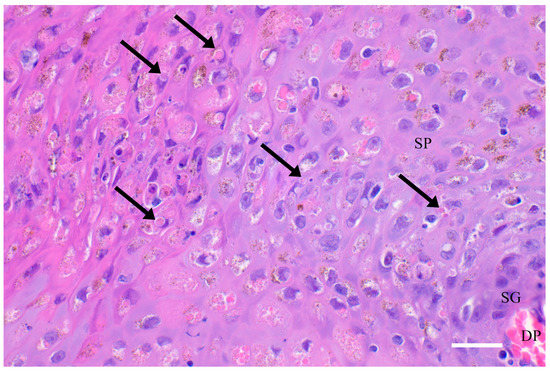 Histology and ultrastructure. Skin from a harbour porpoise (Phocoena phocoena) stranded along the coast of northern California with tattoo skin disease, showing a dermal papilla (DP) with capillaries, the stratum germinativum (SG) and part of the stratum spinosum (SP). Acanthocytes in the SP contain amphophilic cytoplasmic inclusion bodies (arrows). Hematoxylin & Eosin stain, 400x magnification, scale bar = 50μm.