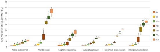 In vitro gas production during incubation of unconventional feeds in buffered rumen fluid at 96 h. Box-plot presentation showing the median, the middle 50% of the data (box), and gas volume ranges. Error bars represent maximum and minimum values per sample, while different letters indicate significant differences among the species, with the p-value significant at p ≤ 0.05.
