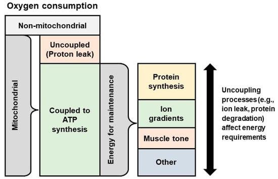 On a cellular level, nutrients from the diet are metabolized to accomplish vital functions, including protein synthesis, muscular contraction, and the maintenance of ion gradients across membranes. However, the energy demand does not come from these processes; rather the additional energy required for cellular maintenance is due to processes that oppose these functions [11]. These opposing or uncoupling processes include protein turnover, muscle relaxation, and ion leaks. Consequently, decreasing any of these uncoupling processes would be expected to decrease the animal’s metabolic rate and energy requirements (Figure 1). Accordingly, the decrease in metabolic rate would dictate the extent to which uncoupling processes are reduced and the organs that are impacted.