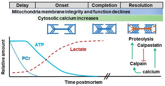 Figure 2. Biochemical, physical, and energetic changes during the conversion of muscle to meat. During the delay phase of rigor mortis, phosphocreatine (PCr) helps maintain ATP levels; as PCr supply diminishes, anaerobic conversion of glycogen to lactate becomes the primary means of ATP production. As ATP becomes limiting, permanent actomyosin crossbridges form that increase muscle tension (onset). Tension is maximal when ATP is exhausted (completion). Subsequently, muscle tension decreases (resolution) due to degradation of proteins by endogenous enzymes. The calcium activated calpain/calpastatin system plays a significant role in disruption of structural proteins, resulting in tenderization. Mitochondria are proposed to participate in these changes through their roles in energy metabolism, calcium regulation, cell death, and oxidative stress.