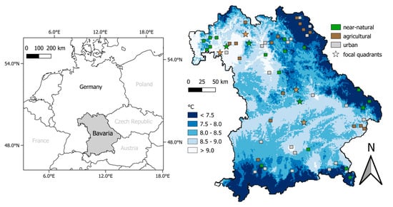 This study was conducted in the federal state of Bavaria, south-eastern Germany (Figure 1), which is the largest federal state, with an area of 70,000 km2 []. It is characterized by diverse climates and high heterogeneity of habitats. The area is composed of 53% agricultural and 7% urban; the remaining areas are predominantly managed forests, nature protection regions, and near-natural habitats (40%, []).