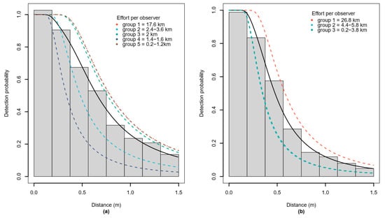 Distribution of observed distances between centers of roe deer dung pellet groups and the transect line: (a) spring, (b) autumn. Dashed lines show the probability of detection for each observer group. Observers were grouped according to the total length of transects they surveyed as a proxy for experience. The solid line is the average estimated detection function.