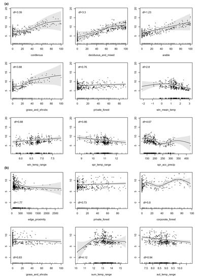 Areas with a higher proportion of forest, arable land, grass or shrubland cover were favorable for roe deer in the spring model (Figure 3a). Relative abundance was also predicted to be higher in areas with larger proportions of privately owned forests, with an intermediate winter mean temperature, a broader winter seasonal temperature range, a lower temperature range in spring, and medium cumulative spring precipitation. The range of the estimated effect of the selected predictors suggests that the habitat-related variables have a stronger influence on the estimated abundance than the climate and management variables.