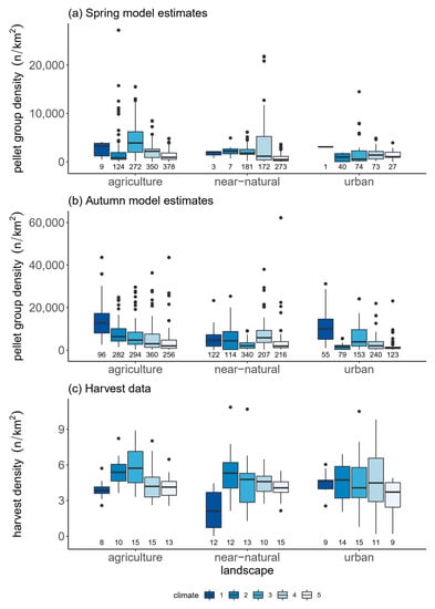 Relative abundance of roe deer in a climate and land-use gradient across Bavaria (a) spring model estimates, (b) autumn model estimates, (c) harvest data. Climate 1 to 5 indicates cooler to warmer mean multi-annual temperatures, which are inversely related to annual precipitation sums. The numbers at the bottom of each boxplot indicate the number of data points: number of 1 km2 grid cells for the spring (a) and autumn (b) models and number of game management districts for the harvest data (c).