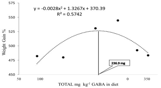 Taking significantly different parameters into account (i.e., WG, SGR, intestinal amylase, serum lysozyme, and cumulative survival of the challenge test), in terms of dietary treatment group, GAB100 and GAB150 consistently outperform other diets. This can further be supported by a polynomial regression analysis of significant growth parameters, which correlates well with other significant, non-growth-related parameters such as amylase activity and those related to immunity, such as disease resistance, as expressed in cumulative survival and lysozyme activity. Thus, in conjunction with ANOVA results, a quantification of optimum supplementation of GABA in this trial was assessed by utilizing a quadratic polynomial (second order) regression analysis employing the formula Y = aX2 + bX + C and applying it to growth according to Pesti et al. [], in order to establish a value of approximately 237 mg/kg, which lies between diets GAB100 and GAB150 correlating to a total GABA content level of 229 and 282 mg/kg, respectively.