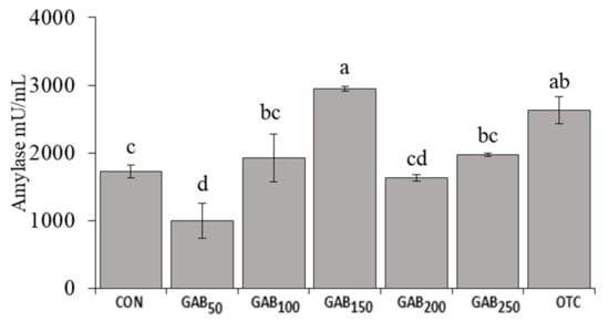 Intestinal amylase activity in juvenile olive flounder fed increasing levels of GABA. Values are mean of triplicate samples. Values with different letters are significantly different according to one-way ANOVA (p ≤ 0.05) and Duncan’s multiple range test (DMRT). See Table 1 for information on diets: CON, GAB50, GAB100, GAB150, GAB200, GAB250, and OTC.