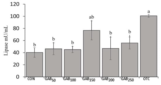 Intestinal lipase activity in juvenile olive flounder fed increasing levels of GABA. Values are mean of triplicate samples. Values with different letters are significantly different according to one-way ANOVA (p ≤ 0.05) and Duncan’s Multiple Range test (DMRT). See Table 1 for information on diets: CON, GAB50, GAB100, GAB150, GAB200, GAB250, and OTC.