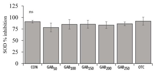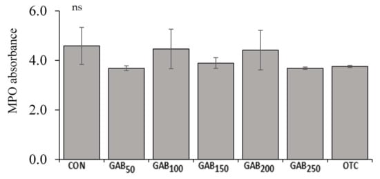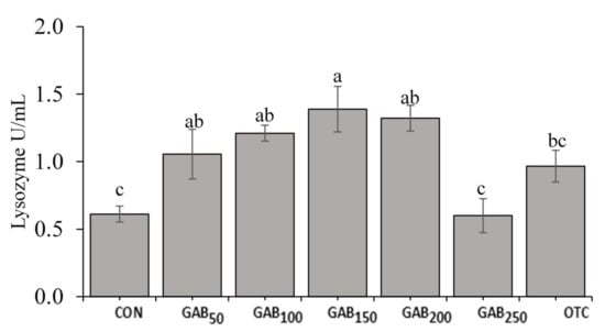 The average lysozyme activities of fish fed GAB50, GAB100, GAB150, and GAB200 diets were significantly higher (p ≤ 0.05) than those of fish fed CON and GAB250 diets. However, there were neither significant differences among fish fed GAB50, GAB100, GAB200, and OTC diets, nor between GAB250 and OTC diets (Figure 4). There were no significant differences in SOD or MPO among fish fed any of the experimental diets (Figure 5 and Figure 6).