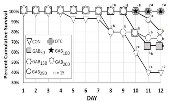 The percent cumulative survival of all fish fed GABA-supplemented diets was significantly higher than that of fish fed a CON diet by the 10th day of the challenge test. Furthermore, by the 12th day, the percent survival of fish fed OTC, GAB100 and GAB150 diets was significantly higher than that of fish fed all the other diets (Figure 7).