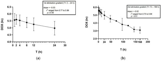 Graphical representations of the change in doxycycline plasma concentrations (log scale) over time are provided in Figure 1a for 0–24 h and Figure 1b for 0–168 h (7 days). The semi-log graphs of the mean doxycycline concentrations in plasma of five koalas portrayed a distribution and an elimination gradient, suggesting a two-compartment model, which was further supported by its Akaike information criterion (AIC) model of fit []. The analysis was weighted for all koalas based on a weighting factor of 1/C2.