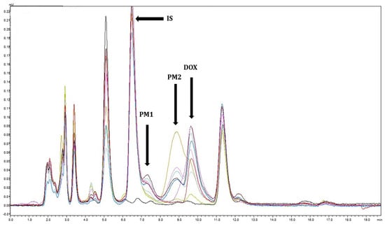Interferences with the doxycycline peak, possibly due to potential metabolites, which were observed in the plasma of a few koalas without other additional antibiotics administered, are demonstrated in Figure 2.