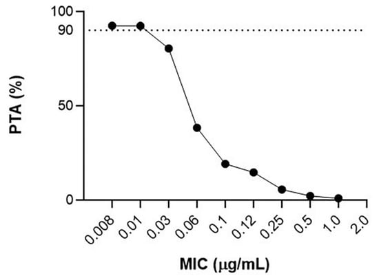 Even though this study did not investigate the doxycycline MIC for inhibiting C. pecorum, reported as 8.0–31.0 ng/mL [], the proportion of doxycycline binding to plasma proteins to provide the unbound fraction was explored. Therefore, according to the PK/PD relationship discussed above, the current dosage suggests that doxycycline remains therapeutically effective for the duration of up to two, three, and even six days after each dose, with the median PK/PD ratios of 42.63, 31.73, and 35.36 at the respective time points at MICs of 31.0, 20.0, and 8.0 ng/mL (Table 3). From the PTA analysis, this treatment was found to be efficacious (PTA of ≥90%) against pathogens with a doxycycline MIC ≤ 0.01 µg/mL (or 10.0 ng/mL) (Figure 3) and therefore, using the doxycycline AUC of 0–24 h, this dosage of doxycycline should inhibit 90% of intravascular bacterial pathogens with a doxycycline MIC range mentioned previously.