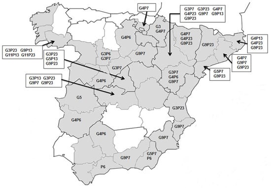 Map of Spain. Pig farms submitting samples for diagnosis of enteropathogens in this study were located in the shaded provinces. Some RVA strains from twenty-six provinces were genotyped at the VP7 and VP4 genes. The occurrence of genotype combinations is indicated.
