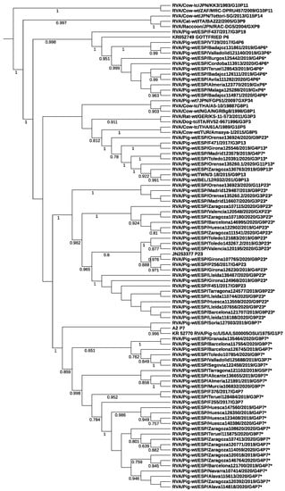 The RVA genotypes were determined according to the guidelines of the RCWG []. Alignment of the consensus sequences against each other and with reference sequences retrieved from GenBank was done using Clustal W and edited with BioEdit version 7.2.5 (https://bioedit.software.informer.com/versions/, accessed on 18 January 2022). Consensus sequences were compared with available rotavirus sequences in the NCBI databases using the Basic Local Alignment Search Tool (http://blast.ncbi.nlm.nih.gov/Blast.cgi, accessed on 18 January 2022). Neighbor-joining phylogenetic trees were constructed for VP7 and VP4 sequences by means of the MEGA software (https://www.megasoftware.net/, accessed on 18 January 2022). The robustness of branching patterns was tested by 1000 bootstrap replicates. Tree drawing was performed online by means of the iTOL v5 tool []. The amino acid sequence of the neutralization epitopes described in VP7 and VP4 was deduced for all Spanish pig RVA strains and compared with the amino acid composition of the same antigenic epitopes in the vaccine strains Gottfried G4P6, OSU G5P7, and A2 G9P7 []. Translation was performed by means of the EMBL-EBI translation tool [].