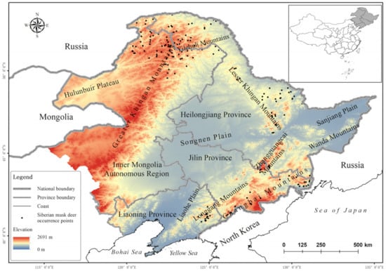 The Siberian musk deer (Moschus moschiferus L.) is the most widely distributed species of the genus Moschus. It inhabits coniferous and broad-leaved mixed forests in Russia, Northeast China, Mongolia, Korea, and eastern Kazakhstan [,,]. Two subspecies are found in China: M. m. moschiferus in the Greater Khingan Mountains, and M. m. parvipes in the Lesser Khingan Mountains and the Changbai Mountains. The International Union for Conservation of Nature (IUCN) classifies M. moschiferus as vulnerable, but notes that the species is declining more seriously than previously estimated and might qualify as endangered []. Understanding the geographic distribution of the species is pivotal in its conservation [,]. Within the last decades, many studies on the biogeography of M. moschiferus concentrated almost exclusively on Mongolia, Russia, and South Korea [,,,,]. The distribution of M. moschiferus in Northeast China is a result of multiple forms of anthropogenic disturbance, but only a few studies in China have provided accurate biogeographical information on the species to support stakeholder decisions on its conservation [,,]. An assessment report of the IUCN also noted that fundamental data on M. moschiferus in China are unavailable []. Therefore, there is an increasing and unmet need to evaluate the core distribution range of the species to support conservation efforts in China.