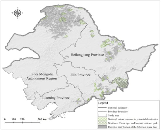 Constructing protected areas is the global key strategy for in-situ biodiversity conservation [,,]. A total of 118,000 protected areas have been established in China as of 2019, which cover 18% of its land area and 4.6% of its sea area [,]. Furthermore, China launched one of the largest natural forest conservation programs globally, including a comprehensive ban on logging in natural forests, to protect biodiversity [,,]. These efforts have resulted in a significant improvement of the natural environment and the populations of some endangered species, such as the giant panda (Ailuropoda melanoleuca) and Amur tiger (Panthera tigris altaica) [,]. However, the construction of protected area networks is flawed and lacks unified planning and coordination in China, which limits their effectiveness [,]. To overcome these limitations, the Chinese government is building a new national park-based system of protected areas for biodiversity conservation []. M. moschiferus inhabiting Northeast China is listed as a flagship species for the establishment of national parks under the China National Standard (ID: GB/T 39737-2020). Therefore, there is an urgent need to identify the potential connectivity corridors of this flagship species and to construct a protection network to establish protected area systems with national parks in Northeast China.