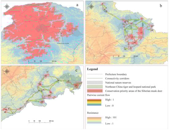In the Changbai Mountains, the population of M. m. parvipes dropped from 3000 individuals in the 1970s to 150 individuals in the 2000s, and the distribution range was reduced to isolated patches with lower human influence []. Resistance values for constructing potential connectivity corridors in this region far exceeded those of the other regions; the resistance value of the Changbai Mountains was twice as high as that of the Lesser Khingan Mountains and 291 times higher than that of the Greater Khingan Mountains (Table S4). Pinch point analysis revealed widespread bottlenecks in the movement pattern of M. m. parvipes (Figure 4c). These are critical linkage nodes for the maintenance of a connectivity network. Such pinch points could be the result of natural and artificial resistance, and should be evaluated in an additional field survey. Nevertheless, we conclude that it is crucial to connect the Northeast China Tiger and Leopard National Park and the Changbai Mountain National Nature Reserve. Despite the two regions having the highest biodiversity in Northeast China, the gene flow of terrestrial species between the two regions has been limited due to long-term human development driving land-use changes []. Along the path of lowest resistance (linkages 26–33, 33–34), Amur tigers and leopards in the national park could also migrate to recovered areas in the Changbai Mountain National Nature Reserve that have become suitable for habitation, which might further help to meet the goal of dispersing tiger and leopard populations. Considering this, we referred to previous research on Amur tigers to set 20 km in width to serve the needs of more kinds of animals [].