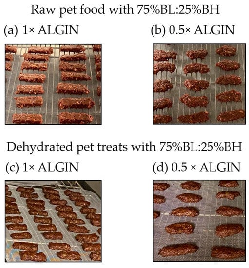 Raw pet food (a,b) and dehydrated pet treats (c,d) containing 75% beef liver (BL) and 25% beef heart (BH) and either 1× (1% sodium alginate + 0.85% encapsulated calcium lactate) or 0.5× (0.5% sodium alginate + 0.425% encapsulated calcium lactate) ALGIN exhibit visible differences in three-dimensional structure.