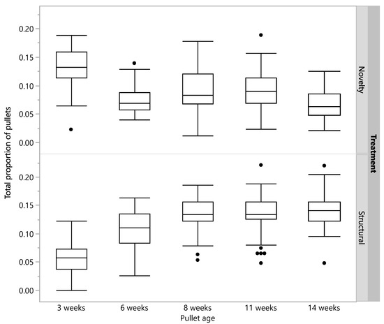 Box plots indicating the proportion of pullets in the pen that were interacting with enrichments in the novelty and structural treatment pens across five age points (3 to 14 weeks of age). The horizontal line within each box indicates the median value with the box ends representing the 1st and 3rd quartiles. The whiskers extend to the outer datapoints that fall within a distance 1.5 × outside the 1st or 3rd quartiles. If datapoints do not reach these computed ranges, the whiskers represent the upper and lower data points (excluding outliers).
