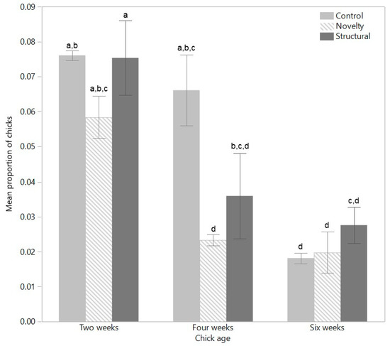 The mean (±SEM) proportion of chicks from three rearing treatments (control, novelty, structural) running within the pens across three age points (2, 4, 6 weeks). a–d Dissimilar superscript letters indicate significant differences across rearing treatments and age. Raw data are presented with analyses conducted on transformed means.