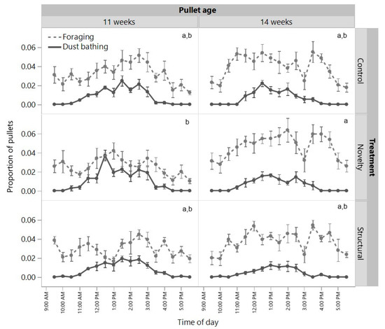 The proportion of pullets from three rearing treatments (control, novelty, structural) dust bathing or foraging across the day as assessed at 11 and 14 weeks of age. a,b Dissimilar letters indicate significant differences between treatments across age for foraging behavior. The raw mean (±SEM) values are presented across the day with statistical tests conducted on transformed daily total means.