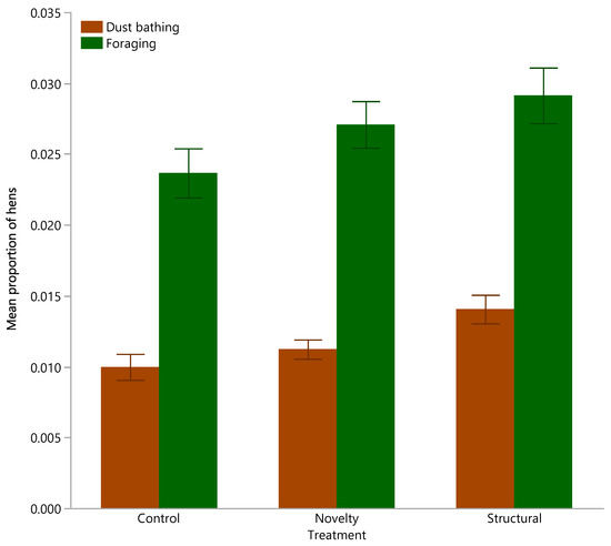 Across all age points there was a significant effect of rearing treatment on the total proportions of adult hens dust bathing (χ2 = 13.81, df = 2, p = 0.001) and foraging (χ2 = 6.53, df = 2, p = 0.04) with the structural hens showing more dust bathing and foraging than the control hens only (Figure 4).