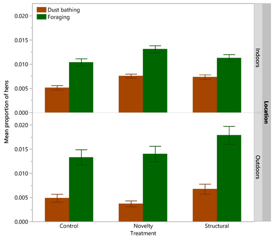 There was a significant effect of rearing treatment on the proportion of hens dust bathing inside (χ2 = 22.54, df = 2, p < 0.001) with both the novelty and structural groups showing more dust bathing than the control hens (both p ≤ 0.0007, Figure 5). There was a significant effect of rearing treatment on the proportion of hens dust bathing outside (χ2 = 11.78, df = 2, p < 0.003) with the structural hens showing more dust bathing than the novelty hens only (p = 0.002), Figure 5). There was a significant effect of rearing treatment on the proportion of hens foraging inside (χ2 = 8.39, df = 2, p = 0.02) with the novelty hens showing more foraging than the control hens only (p = 0.01, Figure 5). There was also a significant effect of rearing treatment on the proportion of hens foraging outside (χ2 = 9.79, df = 2, p < 0.008) with the structural hens showing more foraging than the control hens only (p = 0.006, Figure 5).