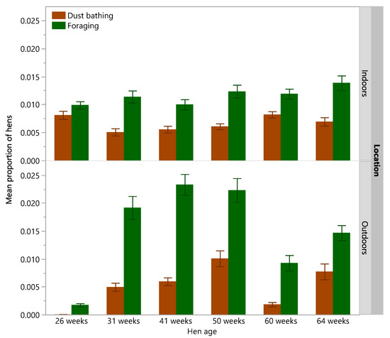 The mean (±SEM) proportion of hens inside the shed (indoors) or outside on the range (outdoors) exhibiting dust bathing or foraging behavior across hen ages (26, 31, 41, 50, 60, 64 weeks). Raw data are presented from all rearing treatments combined.
