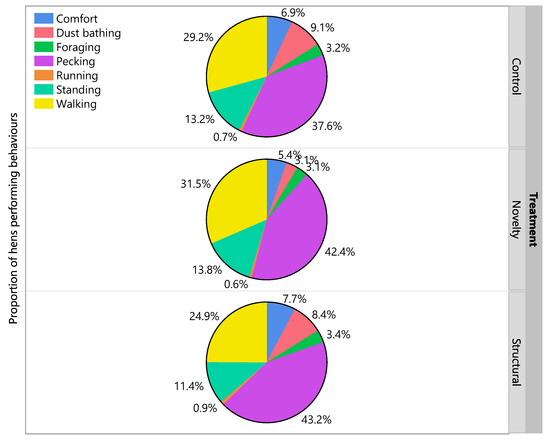 The percentages of hens on a portion of the range performing comfort behaviors, dust bathing, foraging, pecking, running, standing and walking across three different rearing treatments (control, novelty, structural). Observations were made when hens were 50 weeks of age across two days.