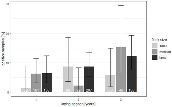 Each flock has been classified according to the number of past production cycles (first, second, and third) and the flock size (small flocks had less than 1000 birds, medium flocks had 1001–2000 birds, and large flocks had over 2000 birds). The birds were tested only once during the entire production cycle.
