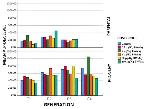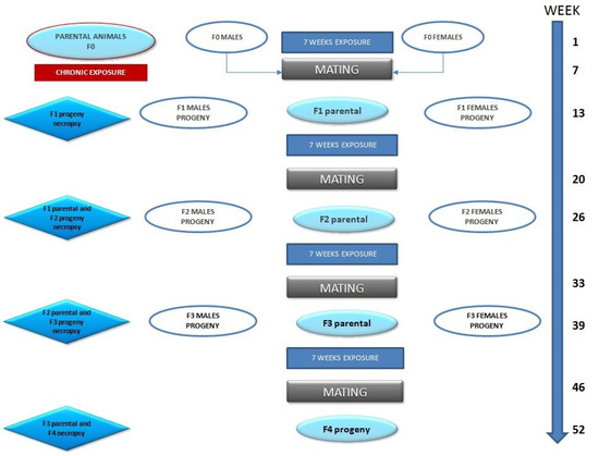 The animals did not present any visible clinical alterations in any of the exposure groups of the different generations throughout the study period, which coincides with what was observed by other authors at these low dose levels of exposure [39].