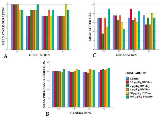 The mean values in days ranged from a maximum of 16 days in the group exposed to 100 µg/kg BW/day in F0, and a minimum of 13 days in the control groups, 0.5 and 2 µg/kg BW/day of F3. Our results did not reveal any differences (p > 0.05) between exposure groups and the study generation. This coincided with the results obtained by other authors, such as Ema et al. [64], who in a two-generation reproductive toxicity study in rats exposed orally to 0.2, 2, 20, or 200 µg/kg BW/day, did not obtain any significant differences in these parameters either.
