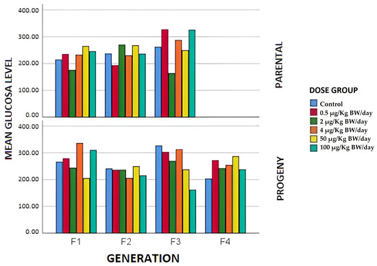Regarding serum glucose levels in breeders in F1, all the exposure groups, except the 2 µg/kg BW/day group, presented higher glucose levels than the control group. The differences were more pronounced in the case of the breeders between the 50 and 100 µg/kg BW/day groups and the control, with the former giving higher mean values, whereas in the 2 µg/kg BW/day group the glucose levels were significantly lower. In the second generation of the study, however, blood glucose levels decreased compared to the control group in all exposed groups except the 2 and 50 µg/kg BW/day groups, in which this level increased with significant differences (p < 0.05). In the reproductive F3, the most notable differences occurred between the control and dose groups of 0.5 and 100 µg/kg BW/day, that presented significantly higher mean values. Thus, this hyperglycemic effect would be transmitted to generations after F0 and could increase with respect to the control, the non-monotonic behavior in the dose-response curve being evident, as can be seen in Figure 3, where the curve’s trajectory changes within the range of the doses tried, exhibiting multiple inflection points for all generations of breeders that is typical of EDCs and, especially of BPA. Based on these results it could be said that exposure to BPA would cause a hyperglycemic effect, possibly due to an abnormal metabolism of the glucose that is transmitted to later generations of breeders and that could be attributed to a likely induction of oxidative stress [50].