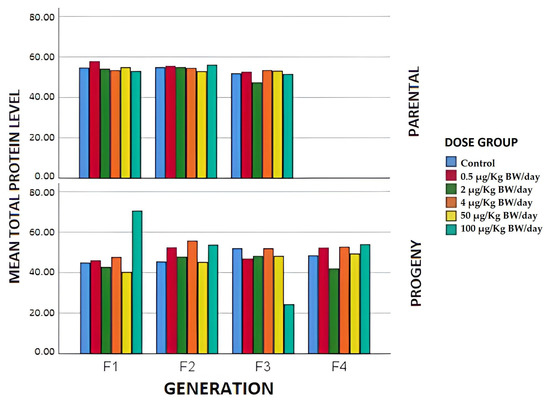 In relation to urea and creatinine, our results (Table 4) for these two parameters did not reveal any significant differences between groups with respect to controls or between generations. Similarly, it was observed that the exposure time did not influence any of these modifications. Nevertheless, some animal studies have reported that exposure to BPA produces kidney damage, with an increase in serum creatinine and a decrease in urea levels. Although, its presence was determined at much higher exposure doses than those tested in this study [61].