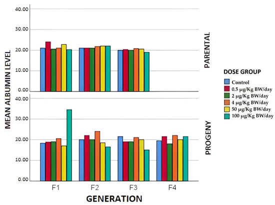 Regarding total protein levels (Figure 4), noteworthy results were obtained in F3, in which there was a significant decrease with respect to the control group in serum total protein levels in the group whose mothers were exposed to the highest dose of BPA. As can be seen in Figure 5, the serum albumin levels in the case of the offspring show a marked decrease in the case of the F2 and F3 individuals, with respect to the controls of the individuals whose parents were exposed to the highest doses of BPA. The F4 animals did not behave similarly, since it was the only group (2 µg/kg BW/day) presenting serum albumin levels below the control group. The reduction in TOT PROT in the highest levels of exposure doses could be due to liver damage. It could be useful to evaluate the liver in future studies, using histological and oxidative stress tests to investigate the effects of BPA on this tissue at different exposure dose levels in the different generations studied.