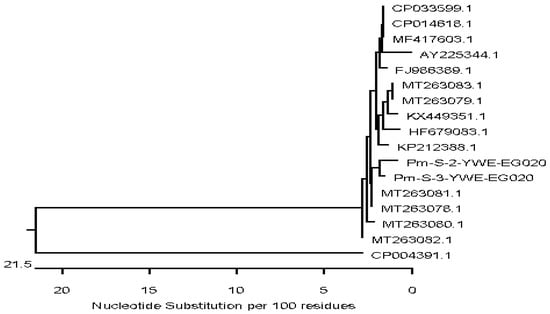 Neighbor-joining phylogenetic tree showing the genetic relationship of two P. multocida strains isolated from respiratory samples of calves and global strains. Two P. multocida strains with accession numbers PM-S-2-YWE-EG020 and PM-S-3-YWE-EG020 were generated in this study.