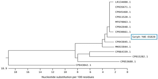 In the same context, the sequence analysis of S. aureus YWE-EG020 generated in the current study revealed a high nucleotide similarity with several S. aureus isolates from various sources and localities (Figure 2). Our isolate was located in the same subcluster, with two identical isolates from the USA (CP042048 and CP030661) isolated from retail and human blood specimen samples and shared 96.8–96.9% genetic similarities, respectively. High identity (96.9%) was also noticed for four S. aureus strains from China (CP045468), Germany (CP011528), India (CP035671), and the United Kingdom (LR134088). Moreover, a high similarity of the study isolate was also noticed with other Staphylococcus species, such as S. epidermidis from Korea (CP043845) with a 95.2% identity and S. pseudintermedius (MK015844) with a 94.8% identity.