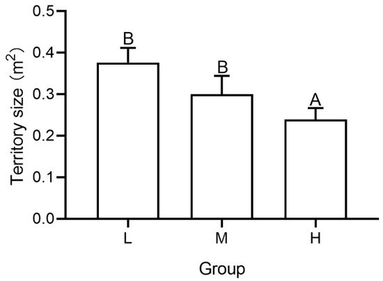 The territory size of occupants was significantly affected by the number of intruders (F = 3.851, p = 0.034, Figure 2). The territory size of occupants in group H was significantly smaller than those of group L (t = 4.173, p < 0.001) and group M (t = 6.146, p = 0.047).