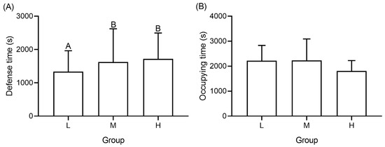 With an increased number of intruders, the defense time of occupants increased significantly (F = 5.217, p = 0.044, Figure 3A), but the occupying time did not (F = 2.364, p = 0.729, Figure 3B). The defense time of occupants in group M (t = 3.129, p = 0.011) and group H (t = 4.467, p = 0.016) was significantly longer than in group L.