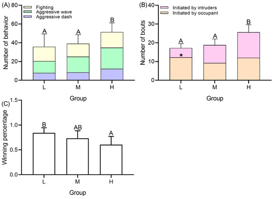 The number of intruders significantly affected the number of territorial behaviors (F = 4.868, p = 0.039, Figure 4A), bouts (F = 8.322, p < 0.001, Figure 4B), and the winning percentages of occupants (F = 5.297, p = 0.047, Figure 4C). With an increased number of intruders, the number of territorial behaviors increased significantly, and the number in group H was significantly more than group L (t = 4.739, p = 0.002) and group M (t = 5.551, p = 0.029). The number of bouts between occupants and intruders also increased significantly, and the number was significantly higher in group H than group L (t = 6.869, p = 0.003) and group M (t = 7.748, p = 0.044). In group L, the number of fights initiated by occupants was significantly higher than those initiated by intruders (F = 8.517, p = 0.024).