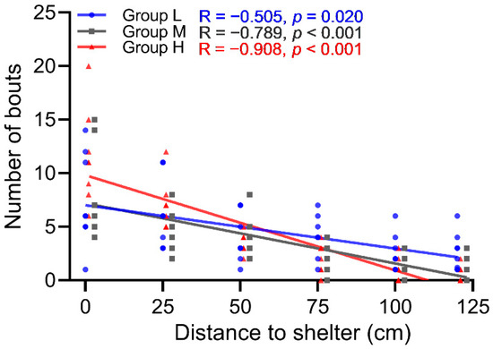 In all three treatments, there were significantly negative correlations between the number of bouts between the occupant versus intruder and distance from the shelter (Figure 5). With increased distance from the shelter, the number of bouts in all groups significantly decreased, but the decreases in group M and group H were much more pronounced compared to group L (group M: R = −0.789, p < 0.001, n = 8; group H: R = −0.908, p < 0.001, n = 8; group L: R = −0.505, p = 0.02, n = 8). Among the eight repeats in group L, five occupants attained the highest David’s Score, two occupants ranked second, and one occupant ranked third (Figure 6). In group L, the David’s Scores of occupants were significantly higher than those of intruders (t = 24.236, p < 0.001, n = 8, Figure 6).