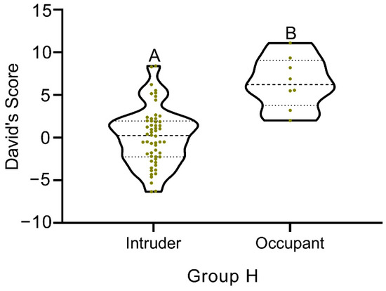 Comparison of David’s Score of occupant and intruder in group H. Capital letters represent significant difference between intruder and occupant (p < 0.05).