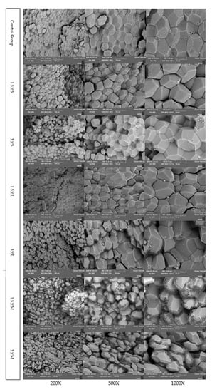 Three eggs were randomly selected from each experimental group and were prepared for microstructure observation according to the method above. The process was as follows: (1) Sample preparation and fixation: the cooked egg yolk was cut into a central slice of 6 mm × 6 mm × 4 mm. The samples were fixed in 2.5% glutaraldehyde (pH 7.2–7.4) for 4–6 h to prevent from disintegration during the experiment. (2) Dehydration: to remove the fixative, samples were washed four times with PBS (25 min each). Samples were dehydrated with different concentrations of ethanol solution in a stepwise manner (20 min each wash), (i) two washes of 30% (v/v), (ii) two washes of 50% (v/v), (iii) one wash of 70% (v/v), (iv) one wash of 90% (v/v), and (v) two washes of 100% (v/v). (3) Drying: the dehydrated cooked egg yolk samples were immersed in isoamyl acetate for 20 min by three times, and transferred to beakers for drying []. (4) Spraying: the dried samples placed on a sample table were sprayed with gold using an IB-3 ion-sputtering instrument []. (5) On-board observation: the prepared samples were placed into a JEM-840 SEM (JEOL Corporation, Osaka, Japan). The samples were observed and photographed at different magnetization rates (200×, 500×, 1000×).
